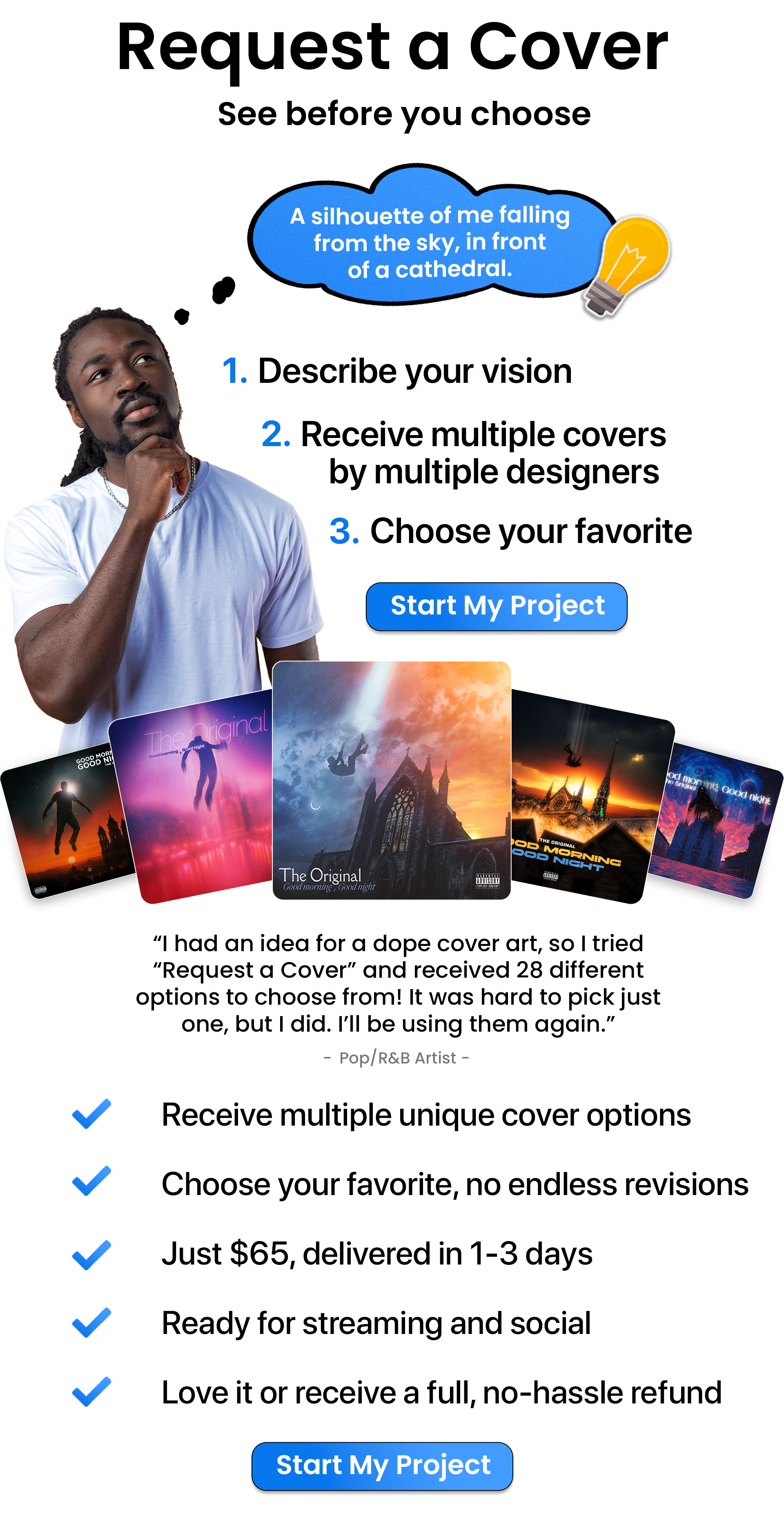 Request A Cover. For those with a "vision" but "open" to exploring different interpretations, you'll receive multiple covers by various designers and choose your favorite. This affordable service delivers covers within hours to 3 days.